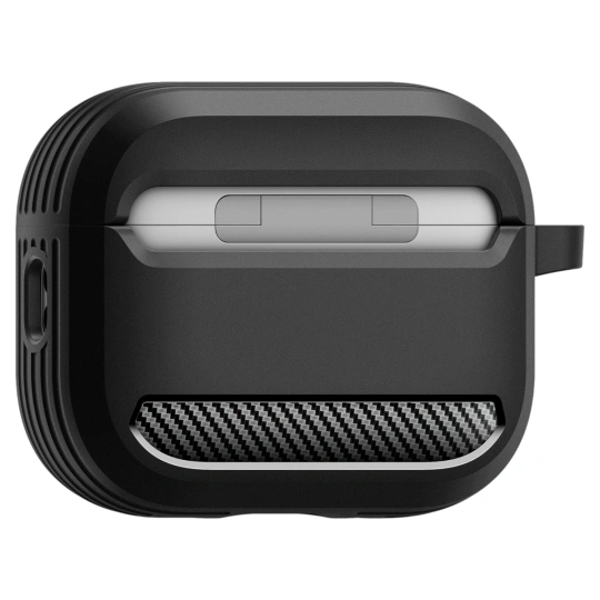 Η σχετικά λεπτή προστατευτική θήκη Spigen Rugged Armor είναι κατασκευασμένη από ανθεκτικό και εύκαμπτο υλικό TPU που είναι ανθεκτικό στην τριβή. Η θήκη είναι καλυμμένη με γυαλιστερά ανθρακονήματα, δημιουργώντας μια κομψή υφή άνθρακα.