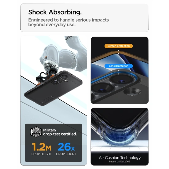 Η υβριδική δομή της θήκης αποτελείται από ένα σκληρό εξωτερικό στρώμα πολυκαρβονικού και ένα εσωτερικό εύκαμπτο στρώμα TPU που απορροφά τους κραδασμούς. Η τεχνολογία Air Cushion στις γωνίες ενισχύει την προστασία κατά την πτώση, ενώ η πρόσθετη εσωτερική στρώση αφρού προσφέρει πολλαπλά επίπεδα απορρόφησης κραδασμών. Η τεχνολογία Extreme Protection Tech εξασφαλίζει προστασία επιπέδου στρατιωτικών προδιαγραφών (Military Grade).