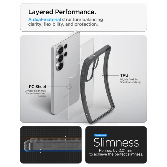 Η θήκη διαθέτει σκληρό πολυκαρβονικό (PC) πίσω μέρος και εύκαμπτο πλαίσιο TPU, προσφέροντας εξαιρετική απορρόφηση κραδασμών και προστασία από πτώσεις και γρατζουνιές χωρίς να αυξάνει σημαντικά το πάχος της συσκευής.